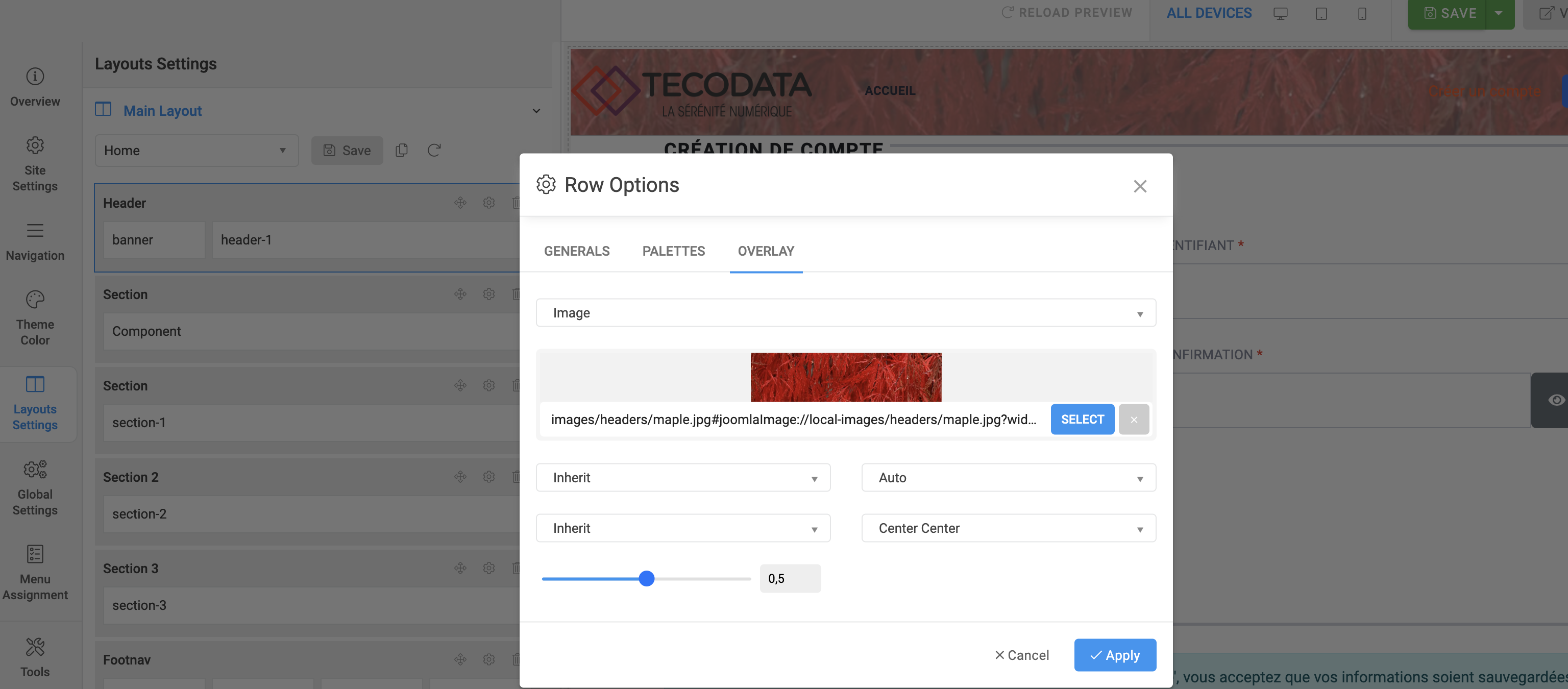 As I can see that you set the overlay background image for the header and it's showing correctly on frontend.