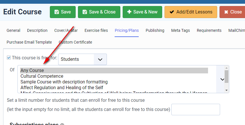 As you can see in the image I provided, I selected a specific course in the Free Course Setting. If there are no free courses available, you can simply uncheck the option "This course is free for".