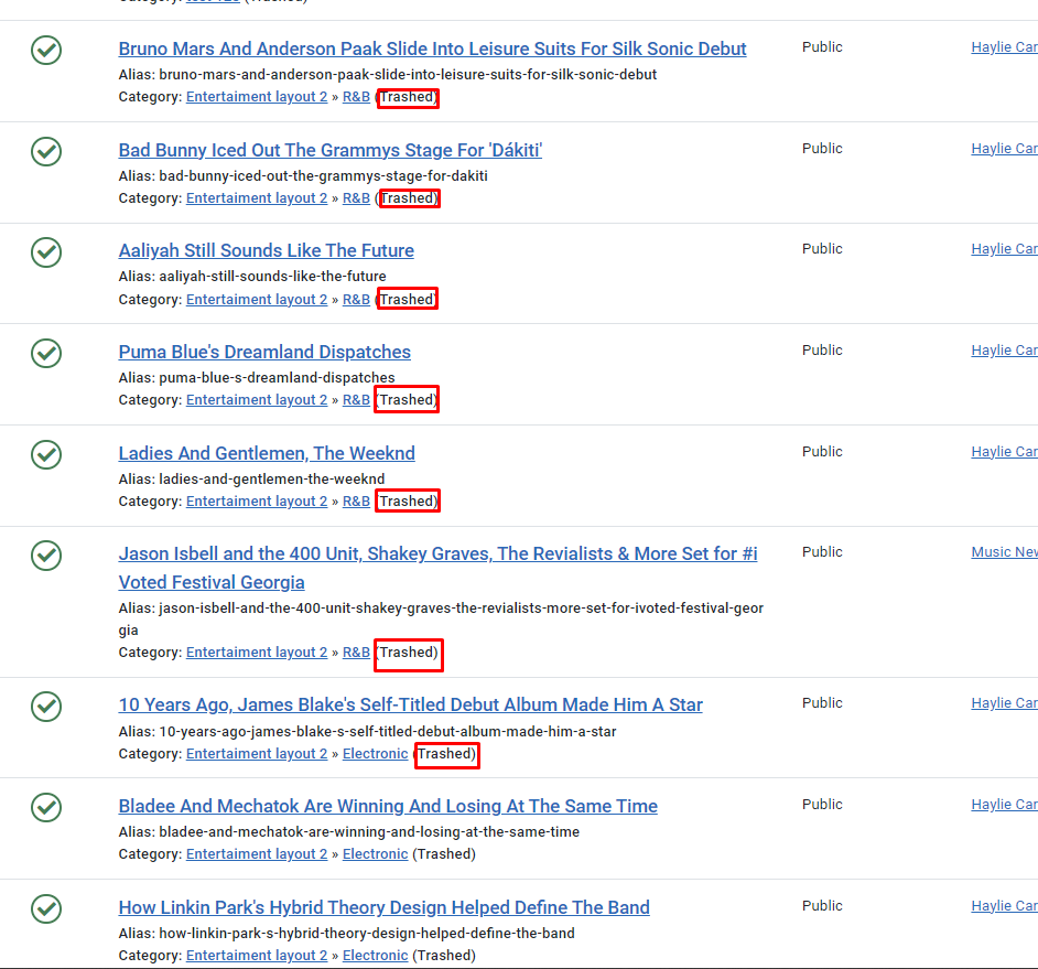 Also all articles are linked to a category, says that these categories are trashed, but nothing trashed!