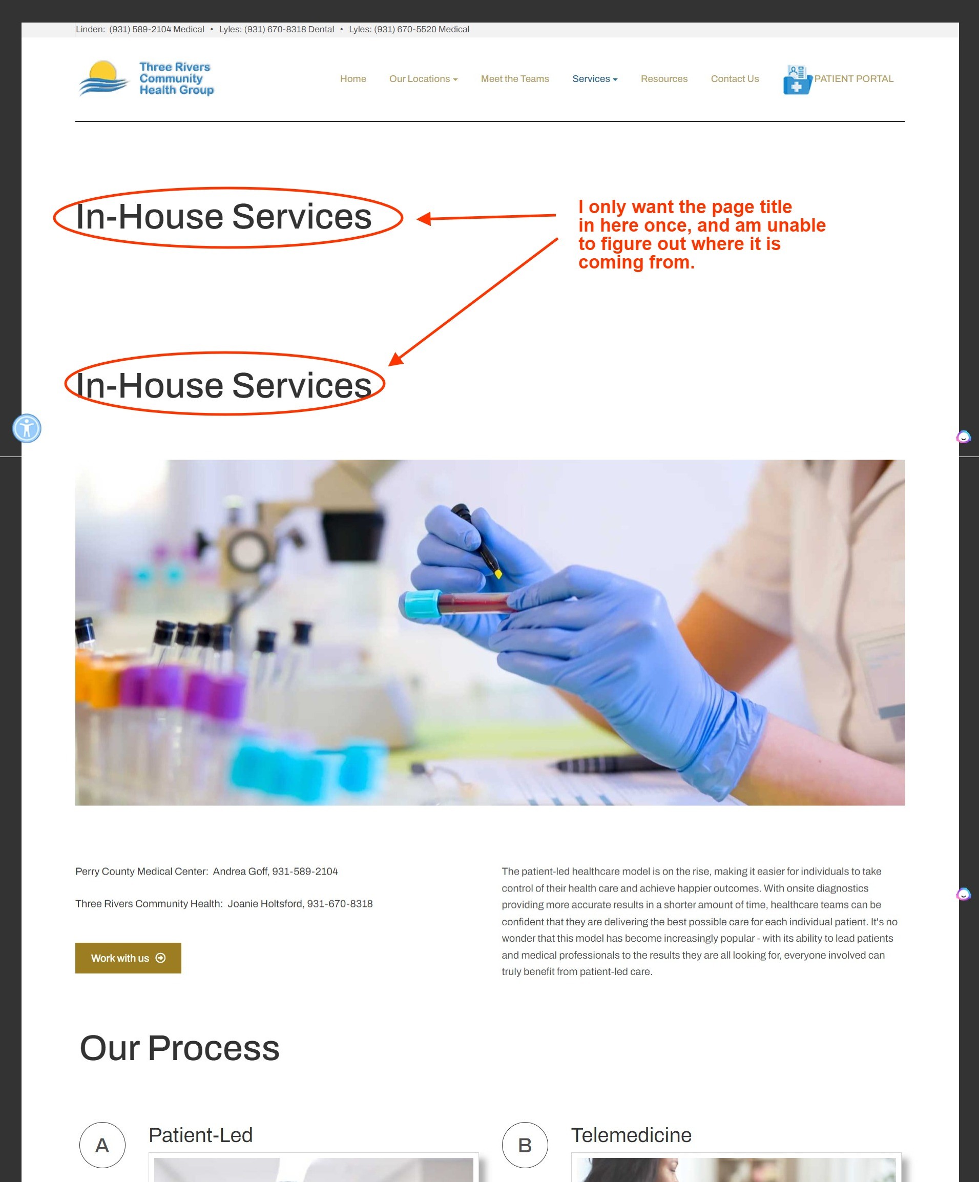On this page the words In-House Services is the menu item, and it is the page title, but I only want it to appear once. Right now it is there twice. I have checked the "masthead" modules, and I have checked the menu item. Please tell me how to get rid of these instances. I'm attaching a screenshot which can give you an idea of what I'm talking about. Thanks.