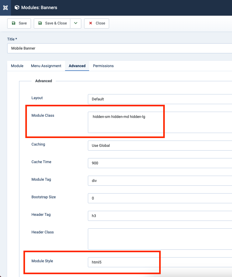 In this case, you want to show on mobile only so I added classes: hidden-sm hidden-md hidden-lg for the banner module and set module style for it: