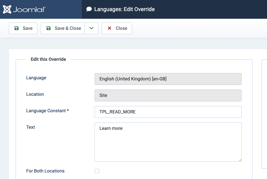 I need to change Read More to my native language. (JA Alumni template) It seems that I cannot do it using Language Overrides... Thank you