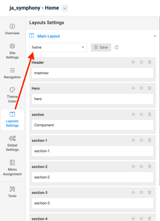 Assign 'home' layout to this 'ja_symphony - Home' template style >> and assign this style to home menu item.