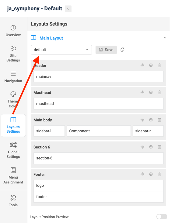 2/ Create a template style ja_symphony - Default and assign 'default' layout for it