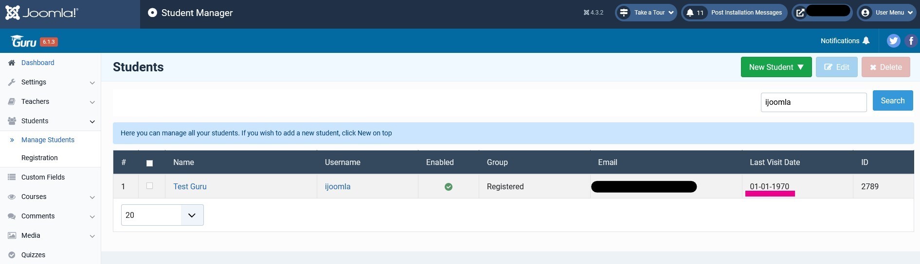 The error manifests itself in the administration of Guru: Student Manager > Students