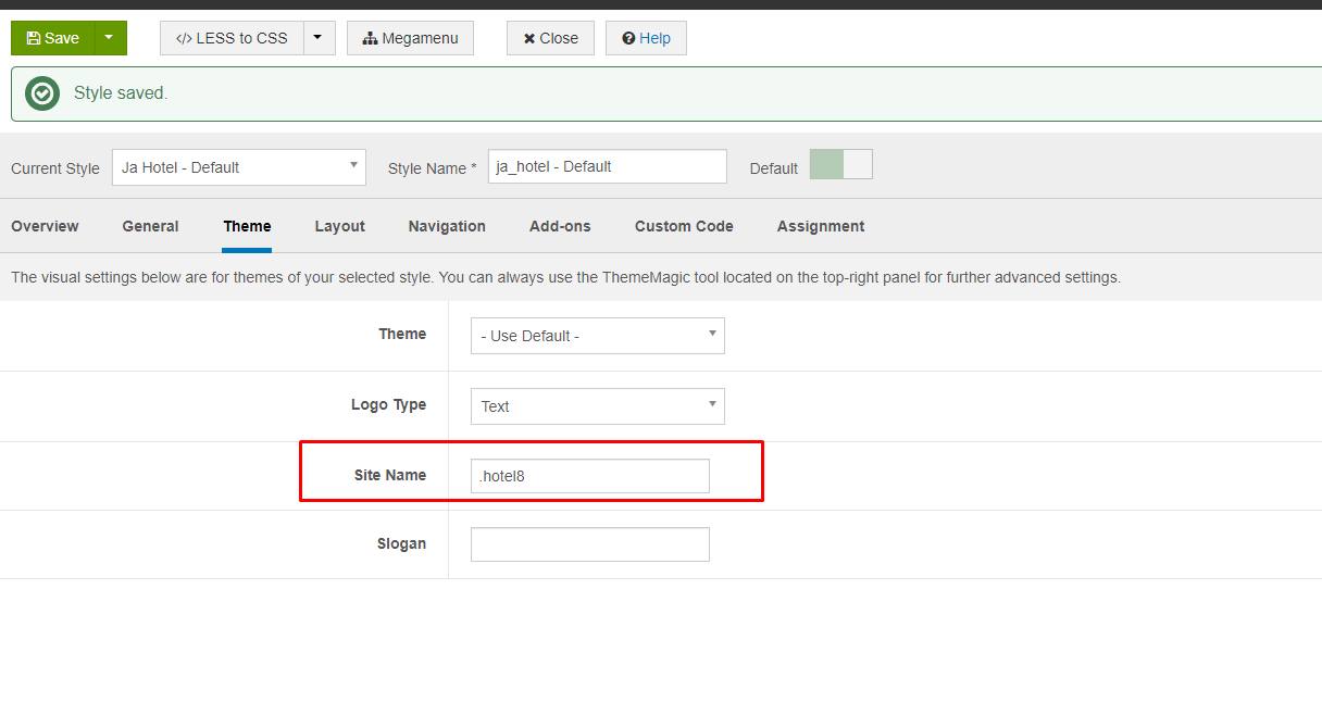 About the logo/site name. The ACM module gets the Site Name From the Backend > Site template style > ja_hotel - Default and opens the Theme tabs.