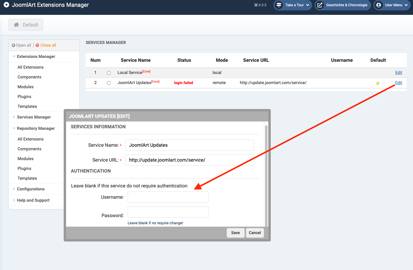 Since this time on the website de.geschichte-chronologie this method does not work, I downloaded JA Extensions manager component on your advice.