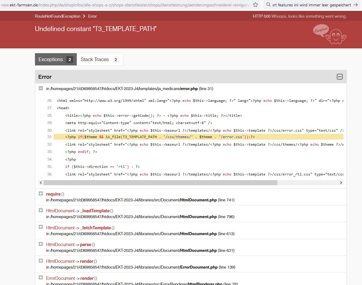On this problematic page, setting the error reporting level to maximum causes a complete site crash. Additionally, on the subpage 'All Shops A-Z', after selecting a shop entry, a router error 'Undefined constant "T3_TEMPLATE_PATH' occurs, preventing content from being displayed. For example: [http://new.ekt-farmsen.de/index.php/de/shopinfos/alle-shops-a-z/shops-dienstleister/shops/dienstleistung/aenderungsschneiderei-reinigungsannahme-1-og.html]