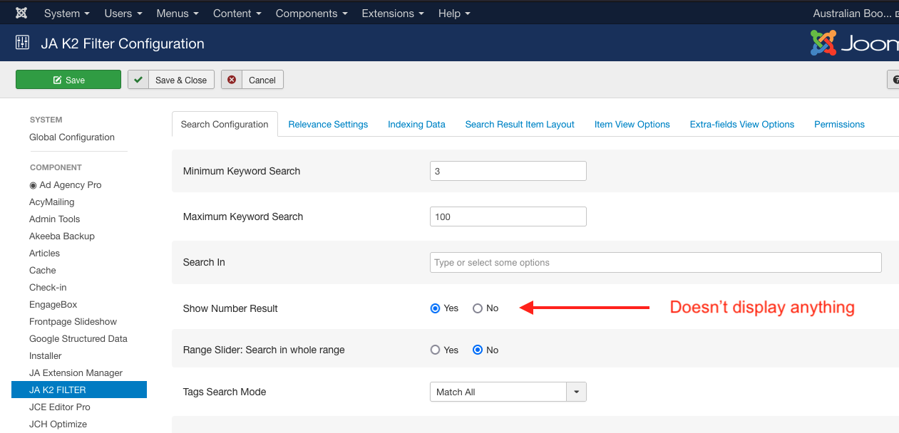 We've noticed that the option to "Show Number of Results" in the K2 Filter configuration doesn't actually display anything as you can see in the attached screenshot of our search results page.