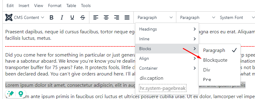 2/ To use the quote, you can select the Blockquote and add the following CSS code to the Backend > Site template Styles > Ja Gamex > Tools > custom CSS: