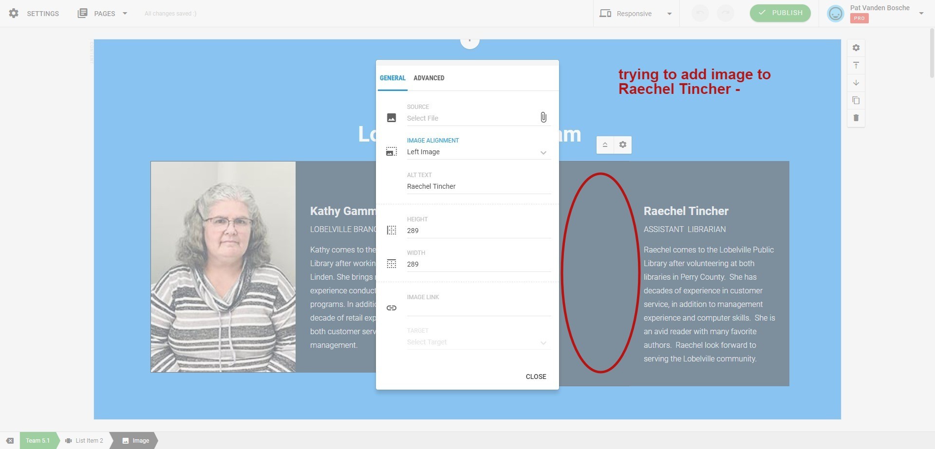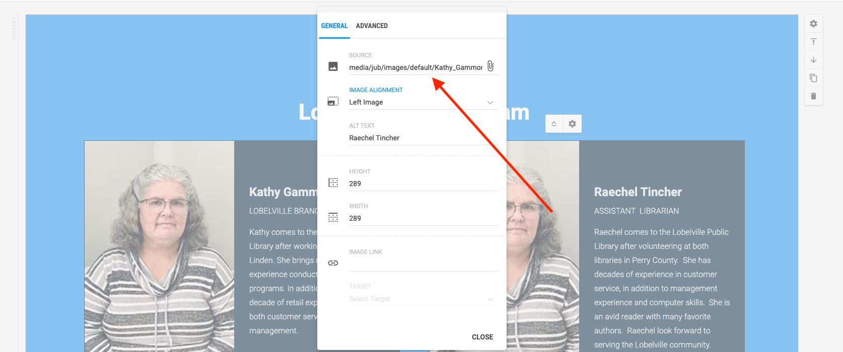 I tried to upload an image on the page, but nothing happened. A directory window opened, I double clicked on the image and waited, and nothing happened. https://perrycountylibrary.info/lobelville-branch?jub=edit