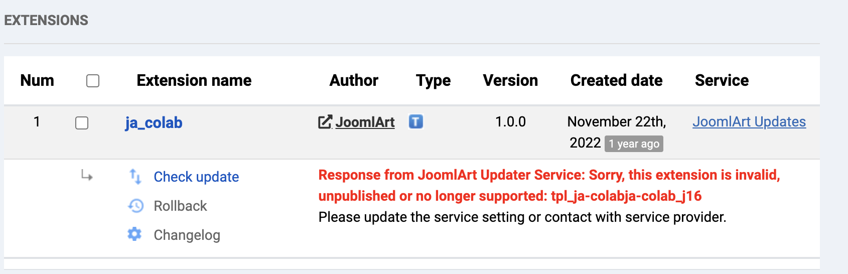 Response from JoomlArt Updater Service: Sorry, this extension is invalid, unpublished or no longer supported: tpl_ja-colabja-colab_j16