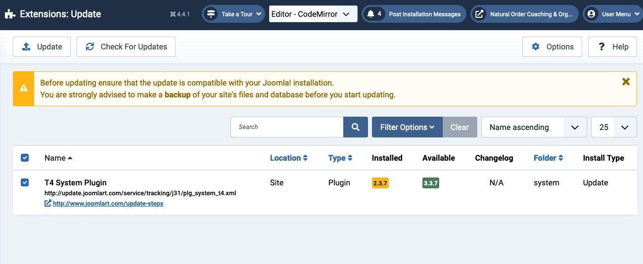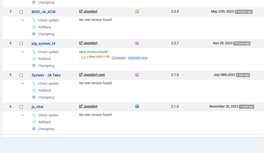See in the latest T4 plugin, after update, it still says it is a new version. It seems like an error in the name of the update, it says version 3.3.7 instead of 2.3.7