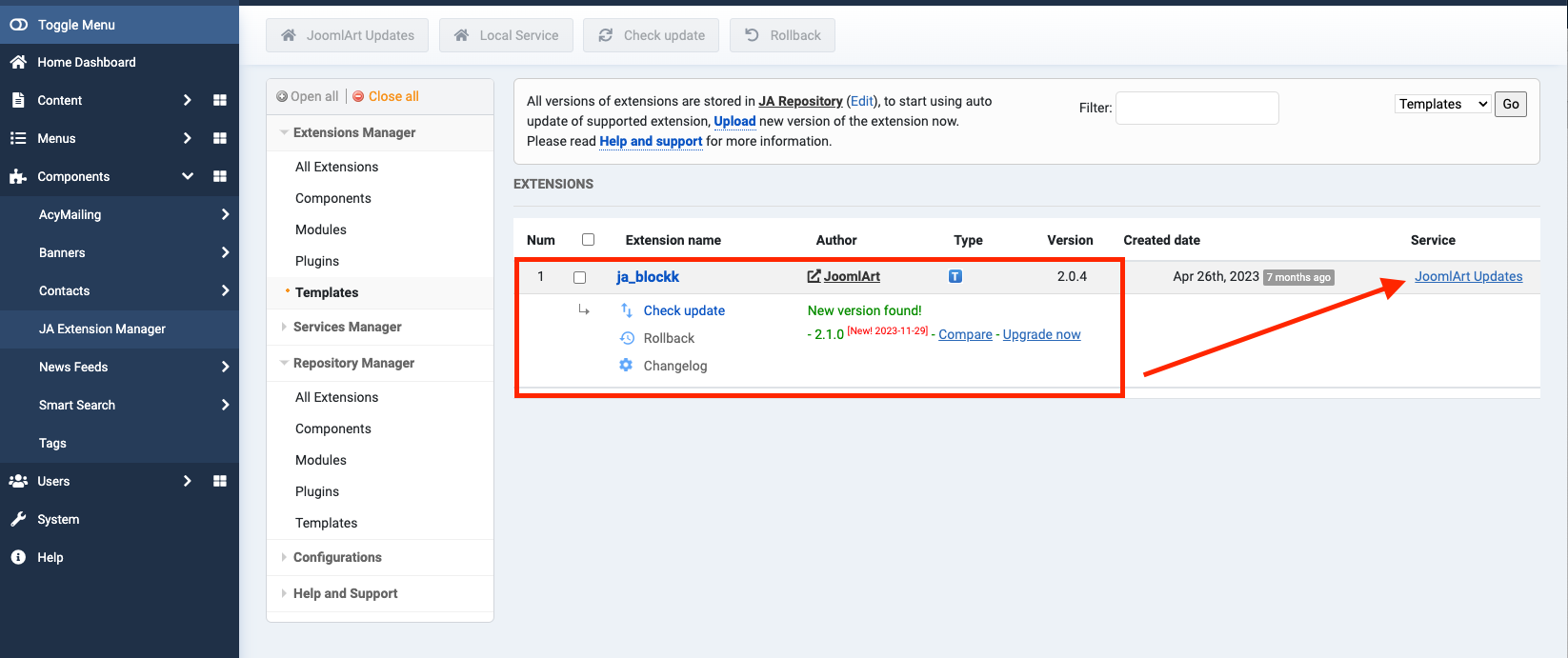 I chose to install the JA Extensions Manager plugin, but that doesn't even know about any new versions of anything, and simply tells me that everything is up to date. It says that JA Blockk version 2.0.4 is the latest version, but Joomla still claims that there is a version 2.1.0 available.