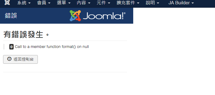 Call to a member function format() on null Hi, I have used JA Mason to develop a site for my company couple years ago. recentaly when loggong in the admin, the page show the above description, and display like the photo attch but all other menu work fine, only the first page can't be shown. how to solve the problem? thank you