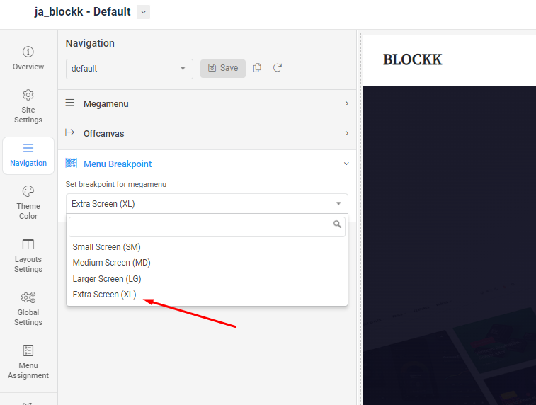 You should select the Extra Screen(XL) for the Menu Breakpoint.