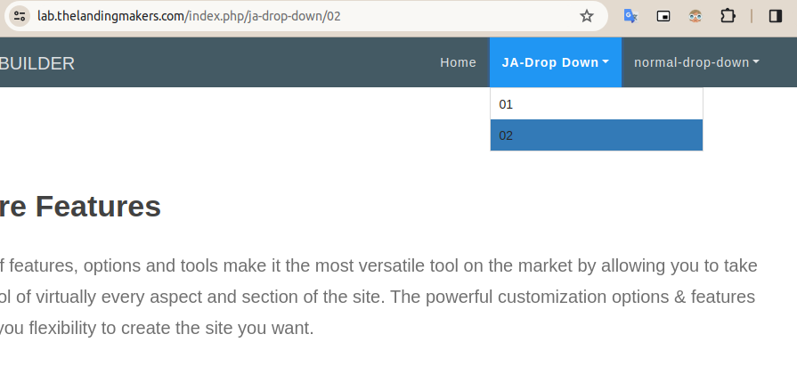 - Two JA-builder items (JA-builder default theme) as part of a menu item called "JA-Droop Down".