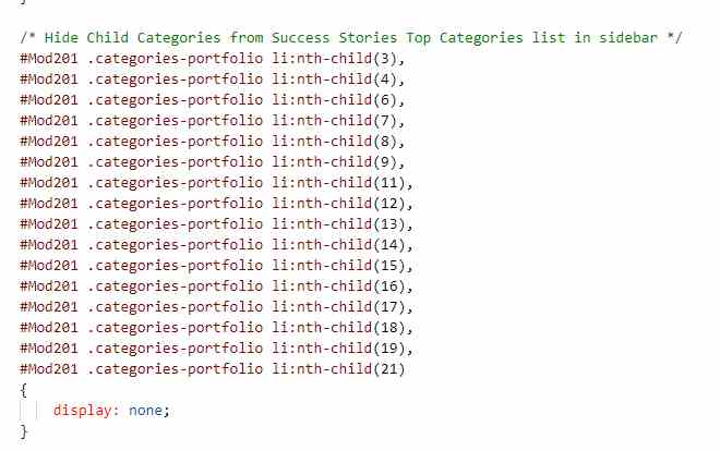 To hide subcategories from the sidebar, you can use the following CSS code: