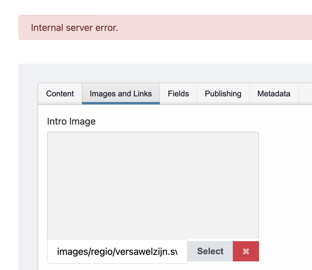 Frontend editing Intro Image gives an Internal Server Error (see attachmentent) and following javascript error: