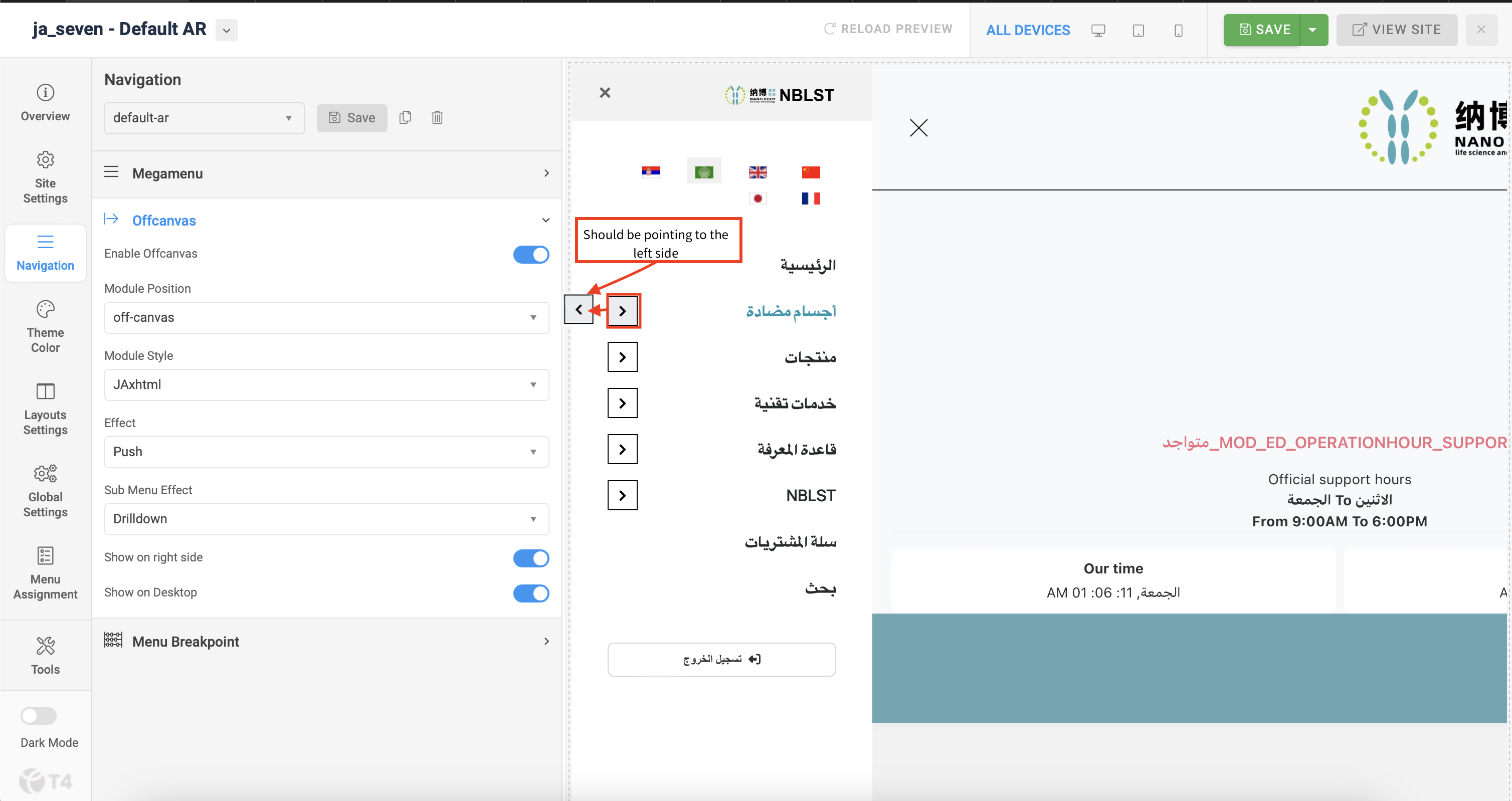 2- Wrong direction: when clicking on the main menu to navigate to the submenu, the direction should go from right to left, not from left to right.