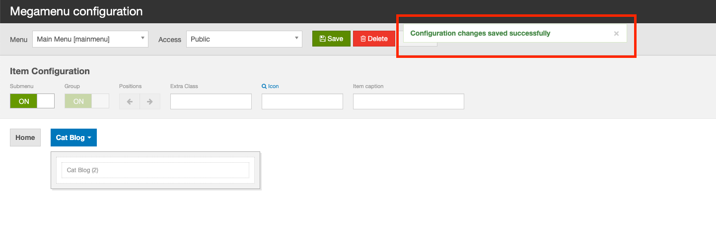 Problem is following. When one adjusts menu in ‘Megamenu configuration’ it’s saving occurs in unusual manner. Usually, when Megamenu works properly, the notification ‘Configuration change saved successfully’ appears. But for Joomla 5 such notification is absent. Saving takes place, but not properly, as you can see from subsequent description.