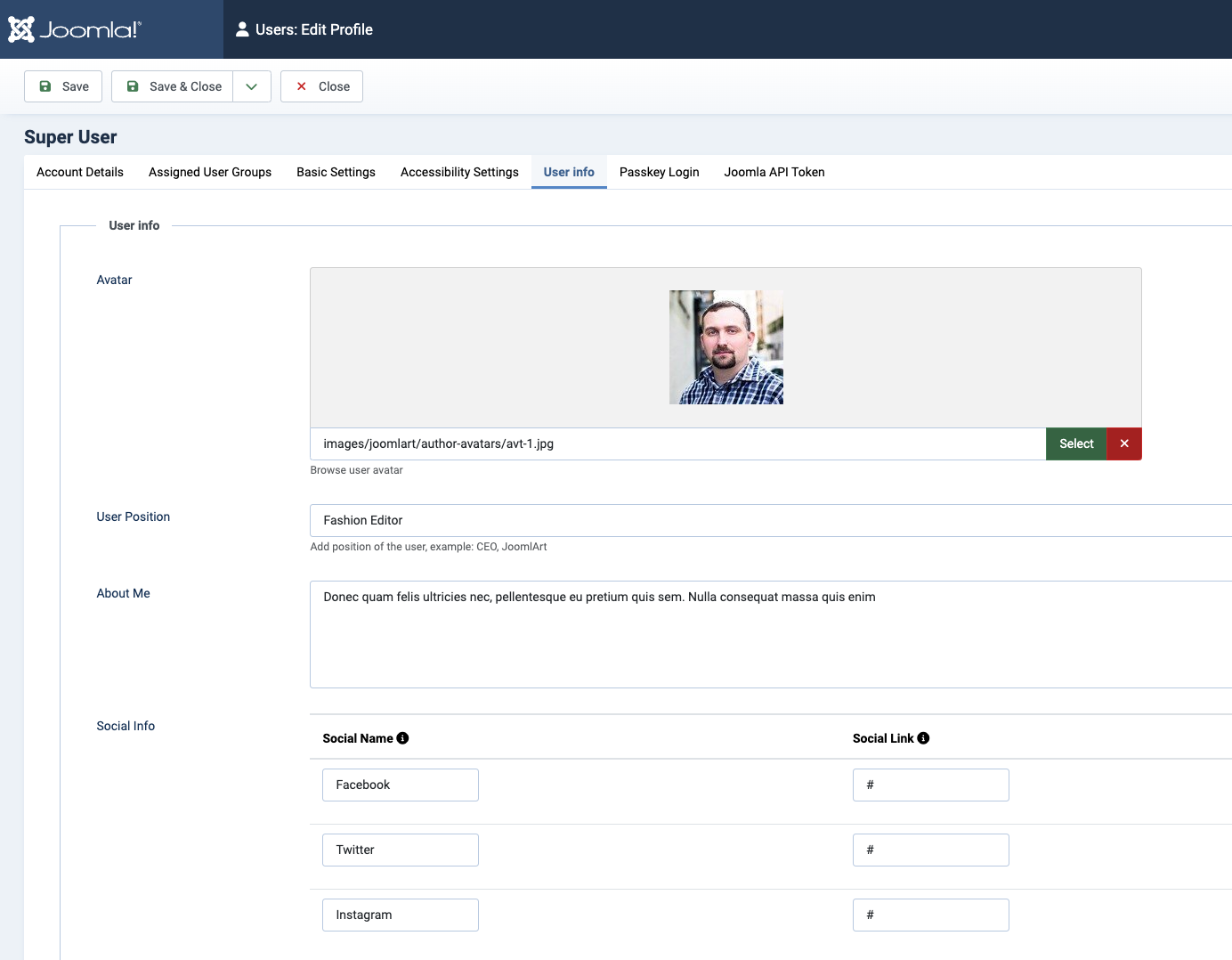 You can find the author's name + bio under User Info tab when editing this user in backend: