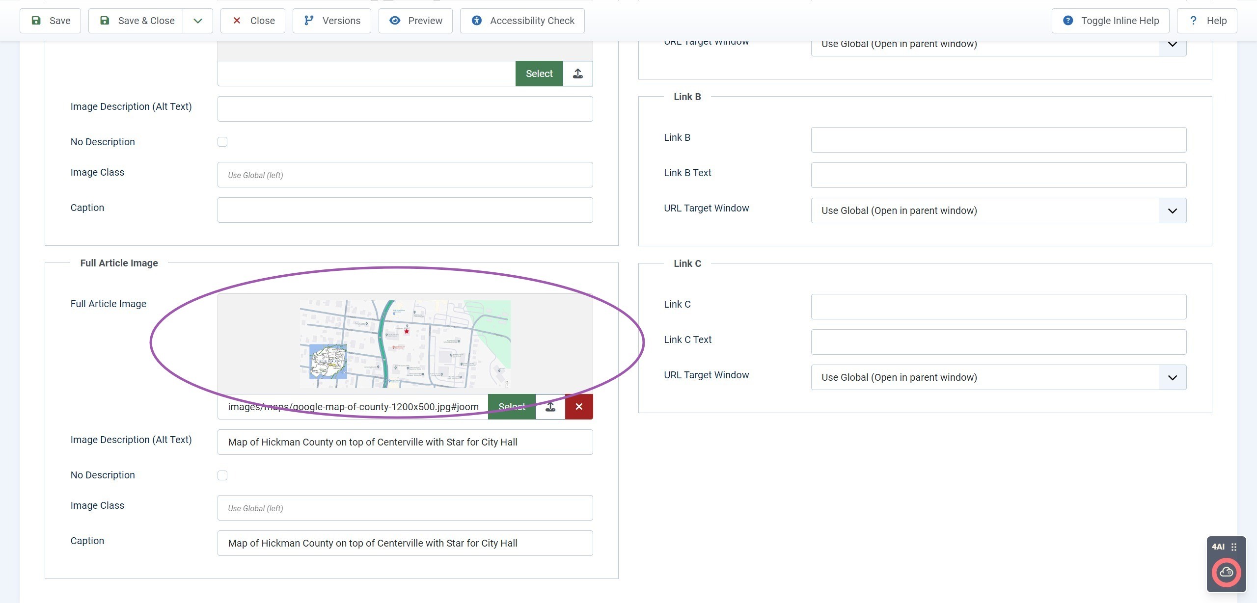 I added an image for the full article image to an article, Images & Links tab, but it never shows up on the article: https://patdevelopment.com/map