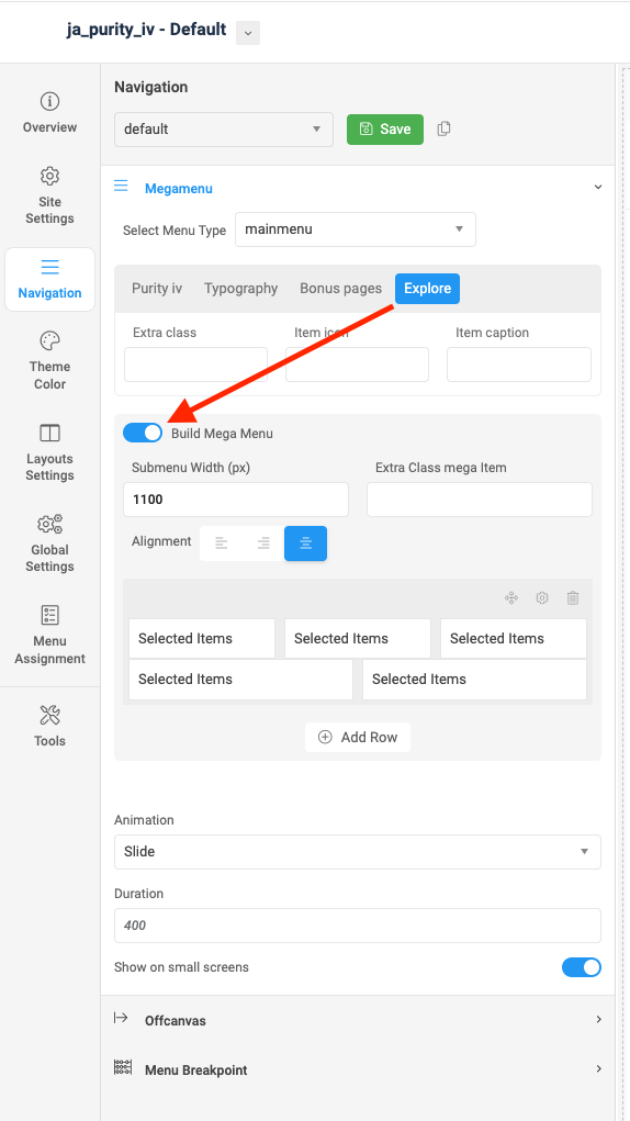 Hello, I discover JA Purity IV (free version) I want to disable MEGA MENU as to use Joomla menu I do not find the "Enable Megamenu" Button in the Navigation page. Can you tell me where I can find it ? Thank you for your reply !