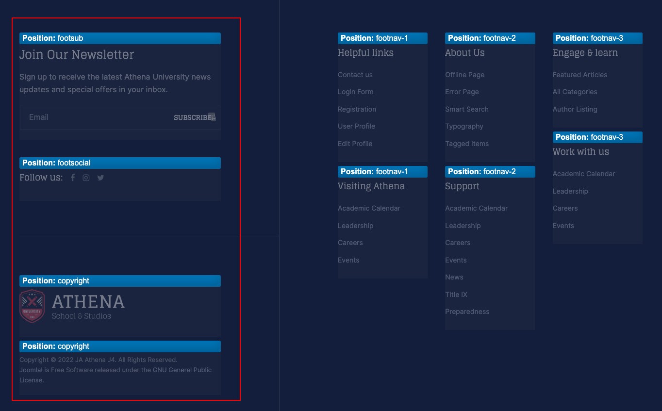 Hi, Following foot module positions are loaded in FOOTER BLOCK in template layout settings but not showing up in Site Modules; • footsub • footsocial • copyright