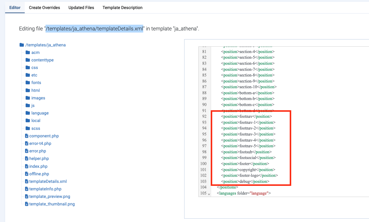 All of module positions are defined in the XML file of template: /templates/ja_athena/templateDetails.xml