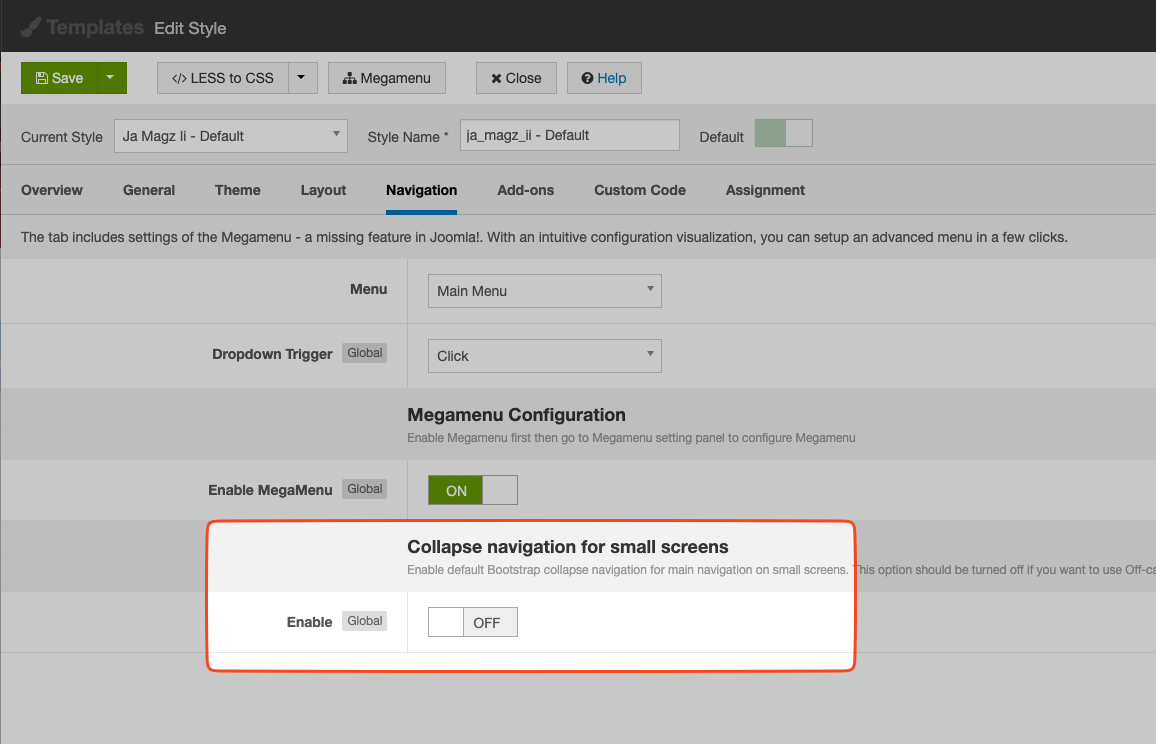 You can access JA Magz II template settings in backend of your site >> Navigation tab and disable the collapsed navigation: