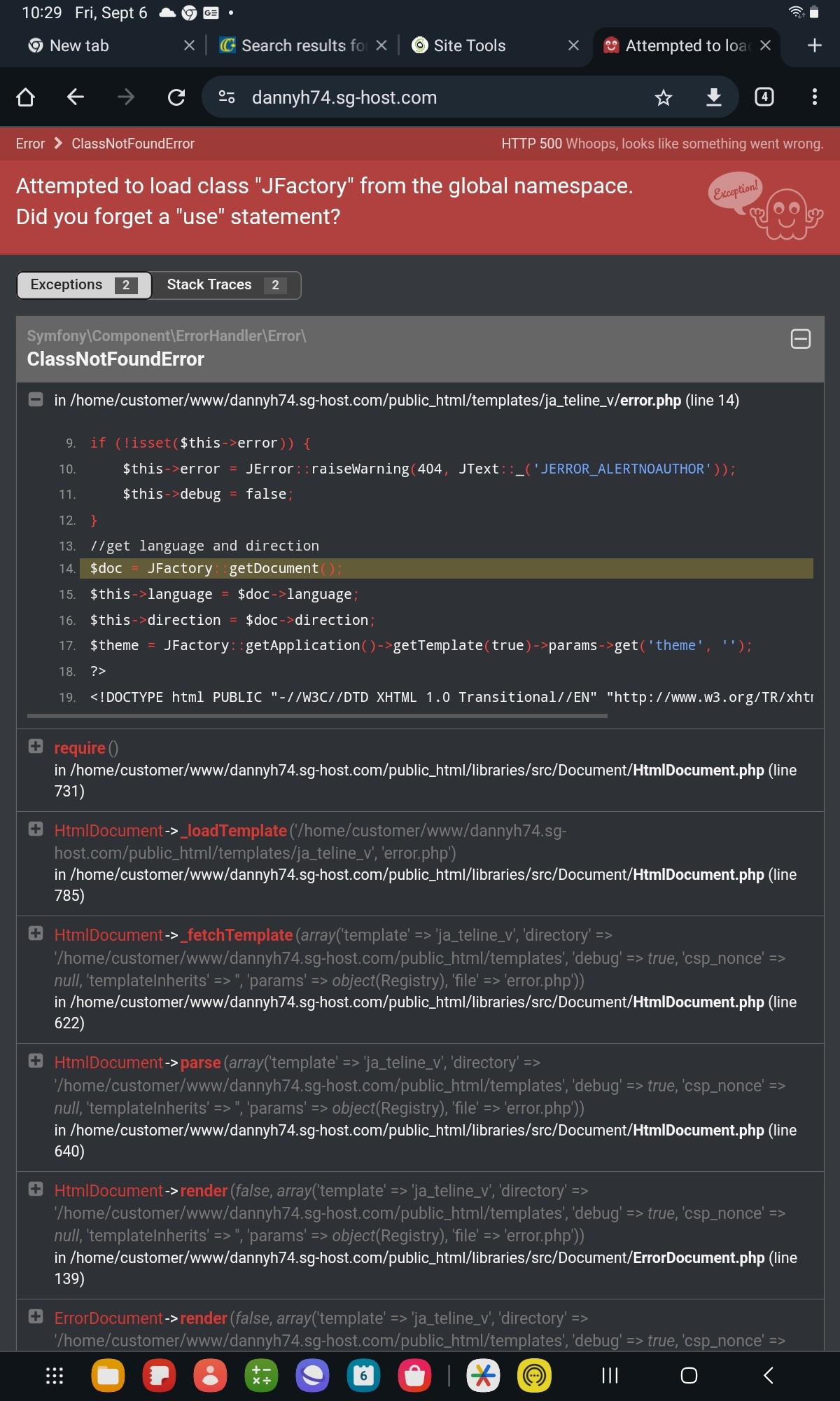 I took a quick look before doing a full restore (my live site, not very professional of me) and it said JFactory .. document .. use statement .. and in Errors many listings that involved T3 php.