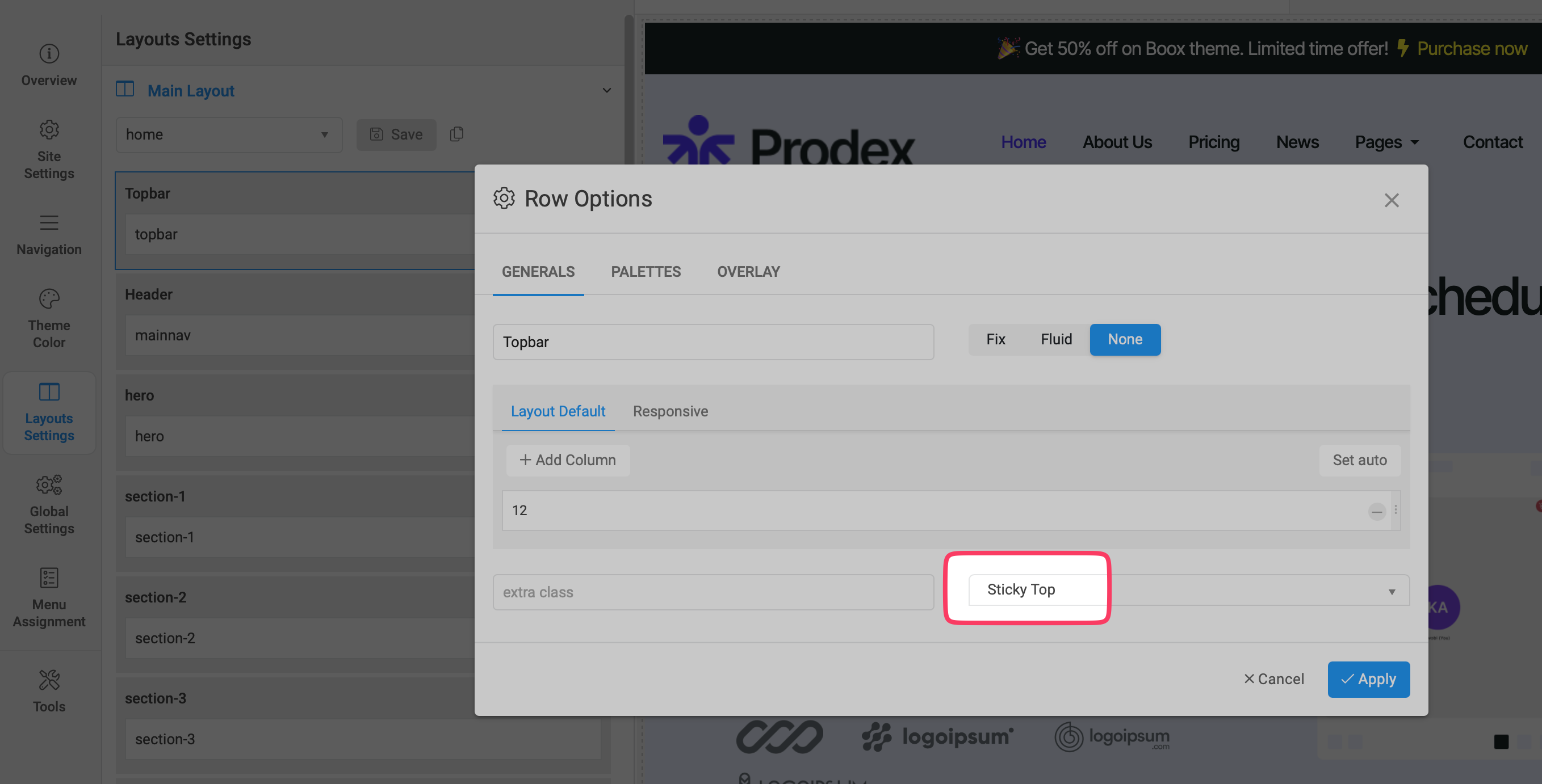 You can access Layout settings in template and set the Topbar section to Sticky Top