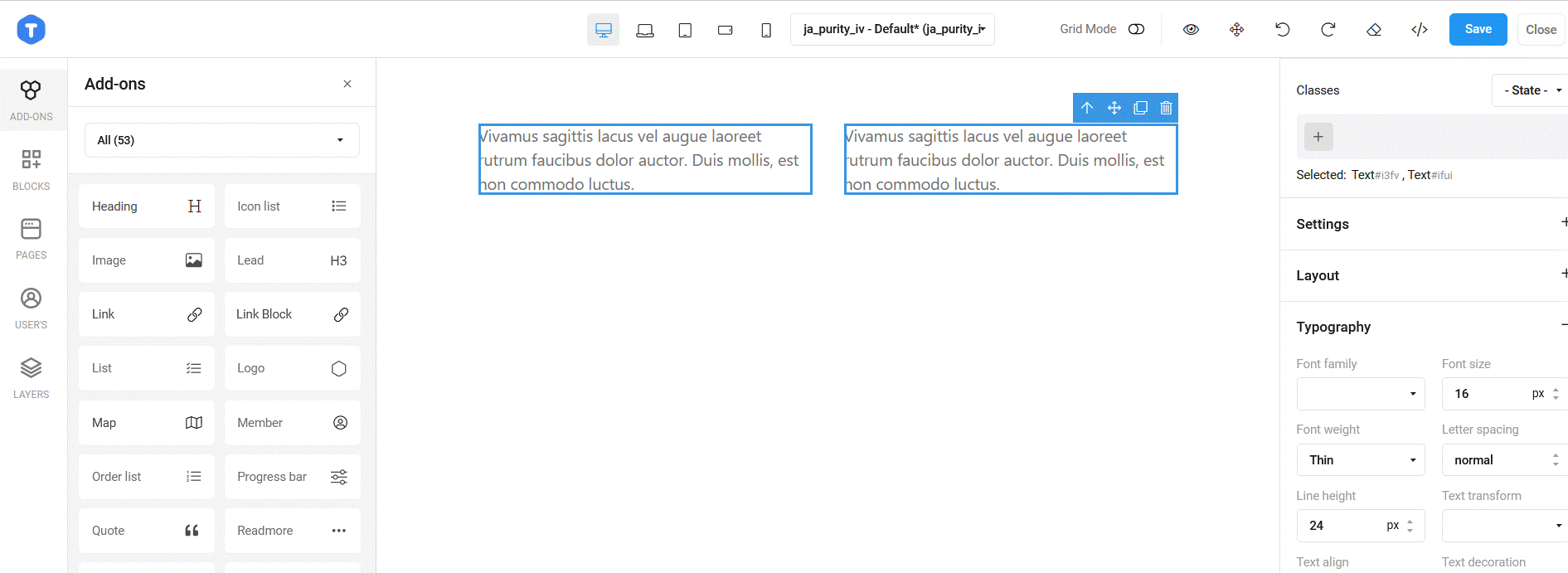 Trying to create a layout with two colums. Once the coulms are created, they are not responsive on mobile devices. Using JA purity 4 joomla template
