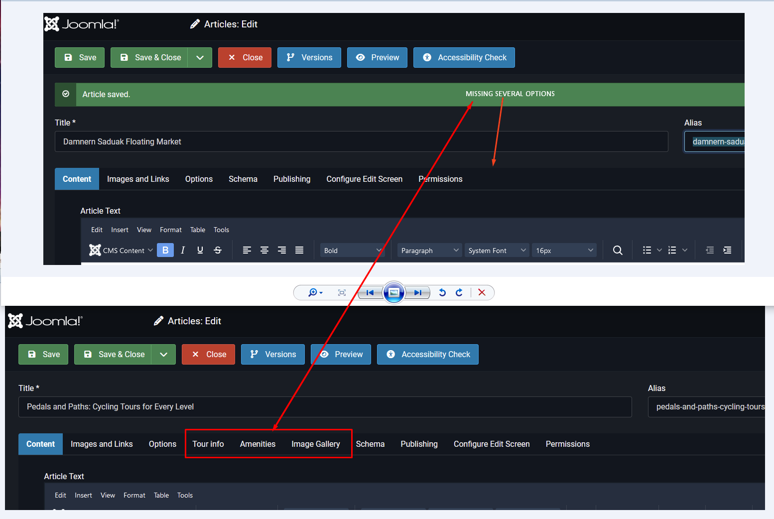 I'm missing several options when I want to edit some articles, or create new article. How do I enable those? Se image below. I'm missing "Tour Info", "Amenities" and "Image Gallery".