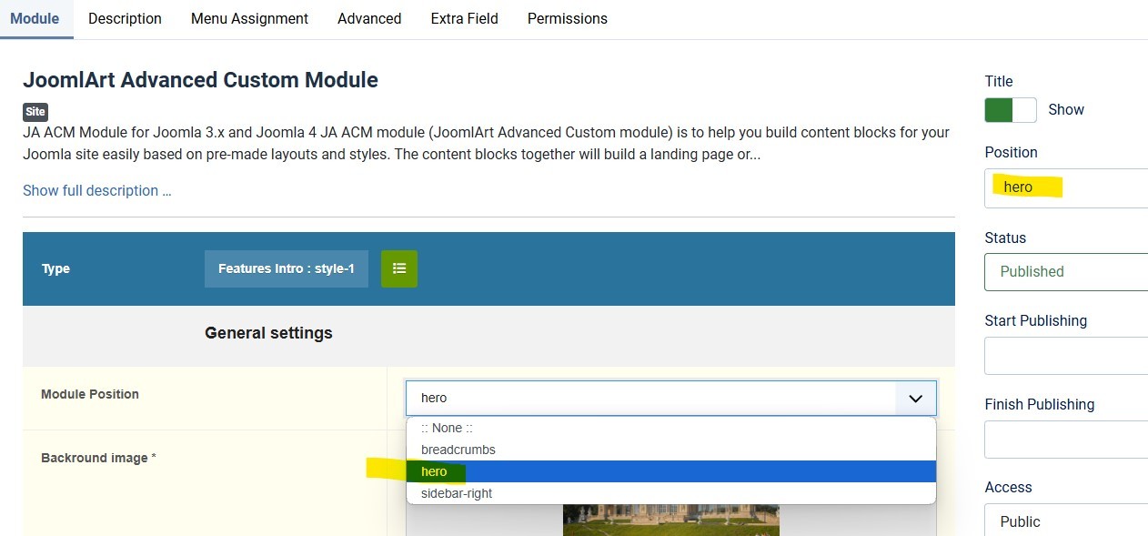 When Position 'hero' is selected in the Joomlart Advanced Custom Module, then there no Hero-search option available under General settings 'Module Position' Results in double titles