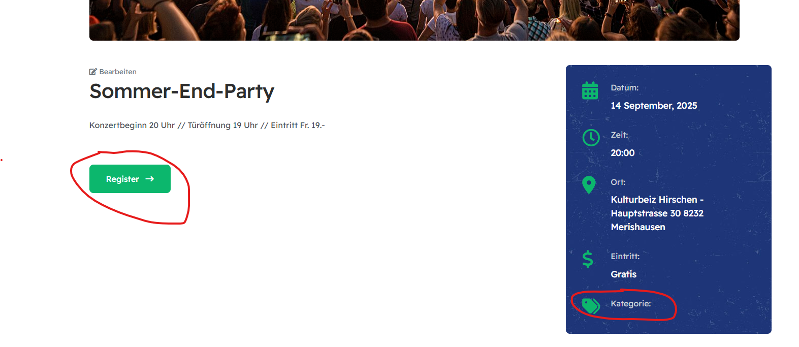 Hi @tobiasdarin, I have overridden the event layout and removed the Register button and category from the events. ([root]/templates/ja_impact/local/html/com_content/article/event.php).