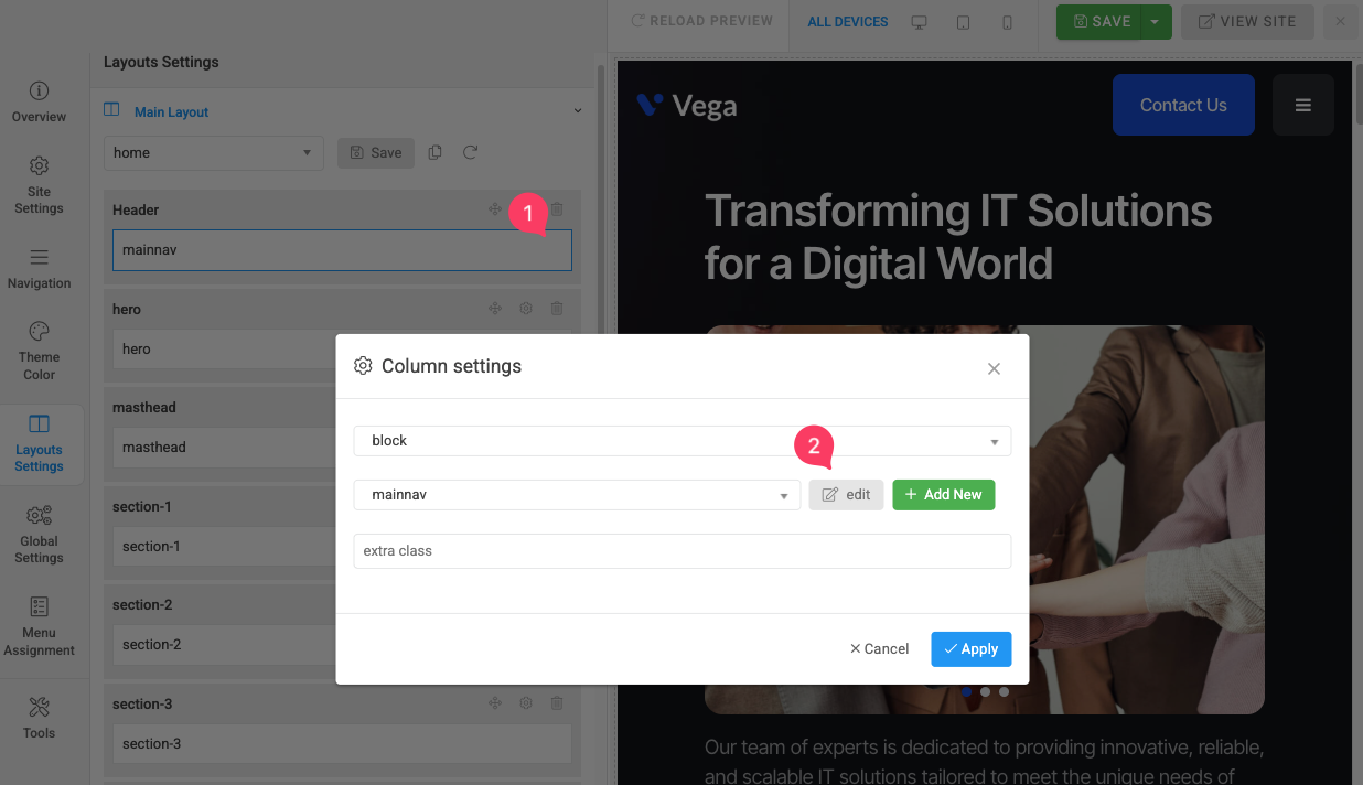 2/ Go to Backend >> edit template style of JA Vega >> Layout settings >> edit mainnav block: