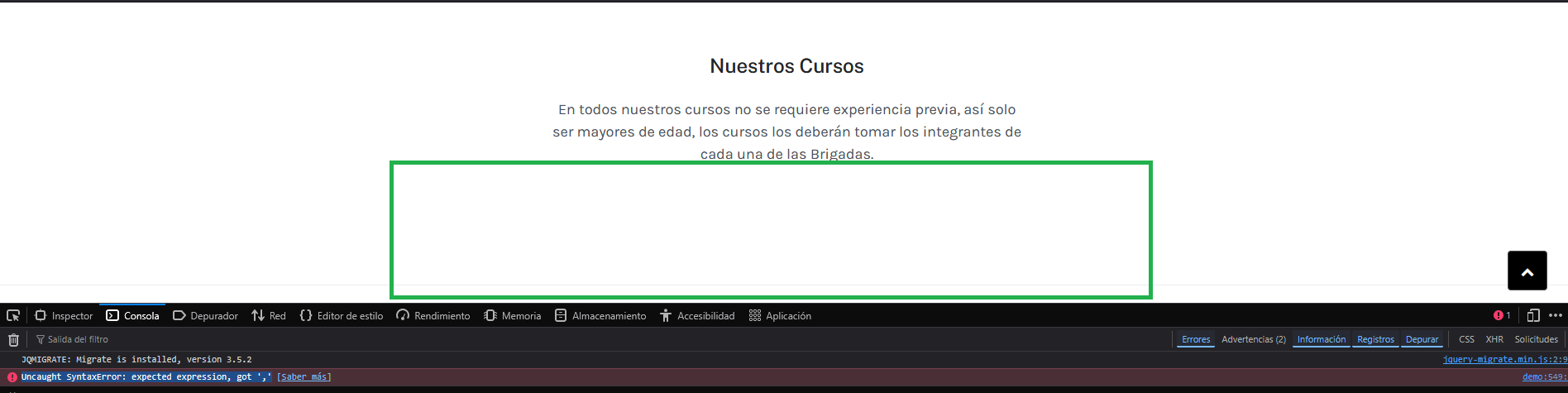 he module does not appear on the webpage when published. Checking the browser console, the following error is displayed: Uncaught SyntaxError: expected expression, got ',' . I am sending an image showing where the carousel should appear but is not visible. What is causing this error, and how can it be resolved?"