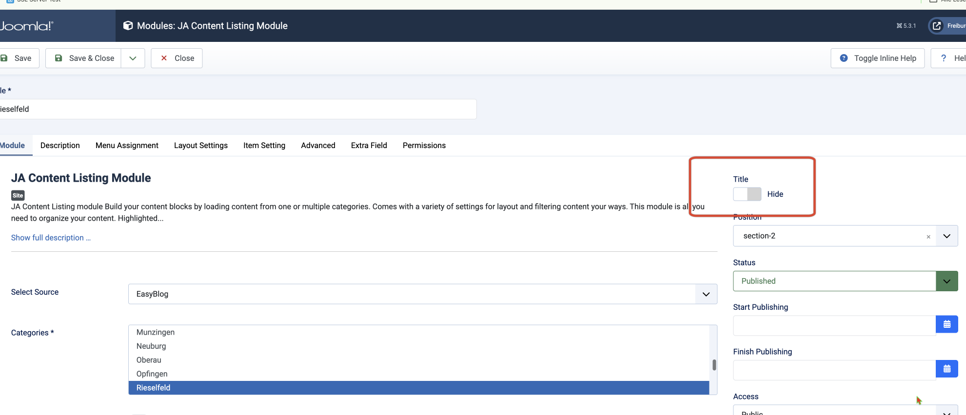 we are using JA Rights template and for content with Easyblog we are using latest version of JA Contentlisting module 1.2.9.