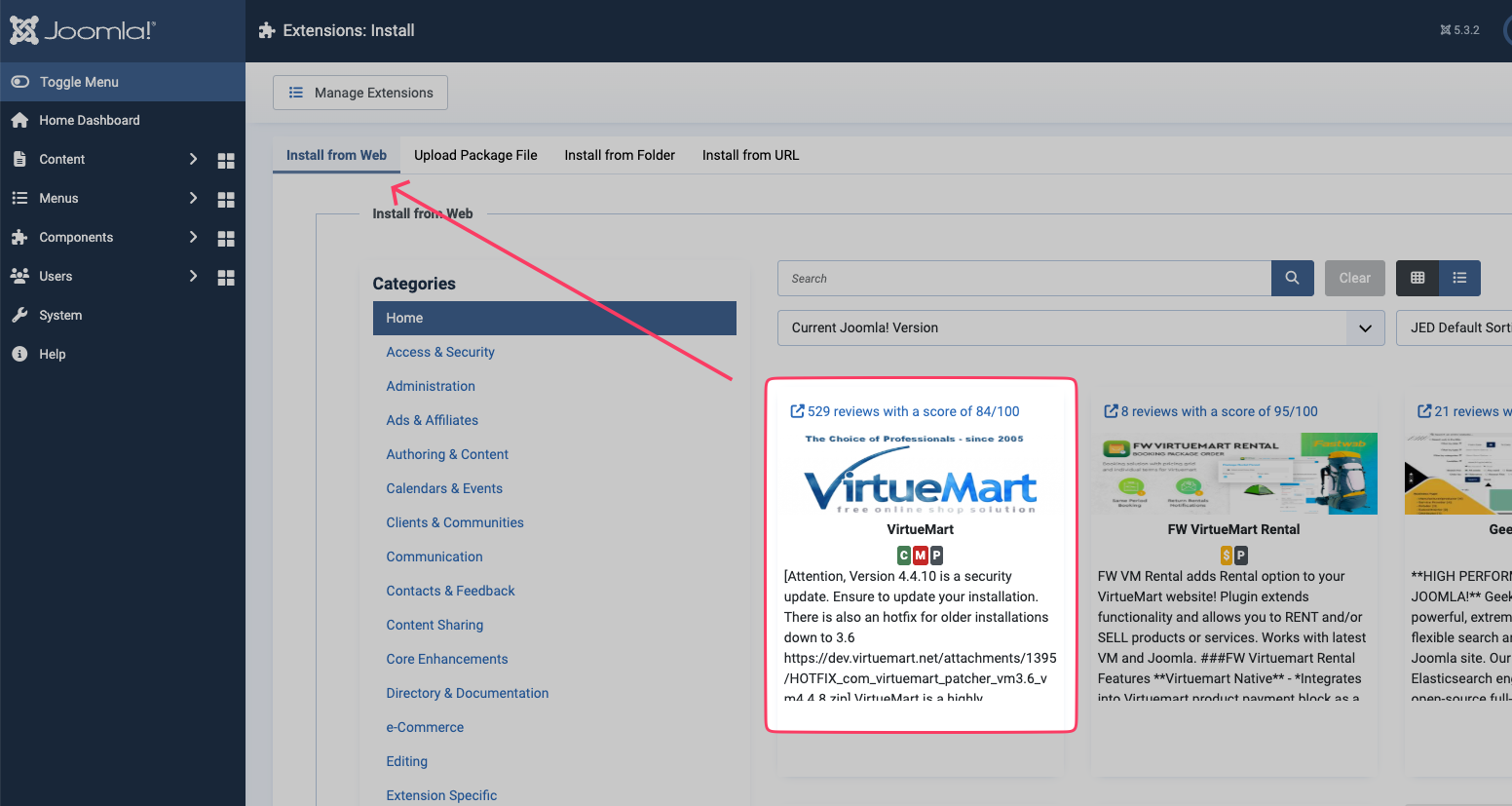 2/ Install Extensions >> Install from Web >> search for Virtuemart and install it