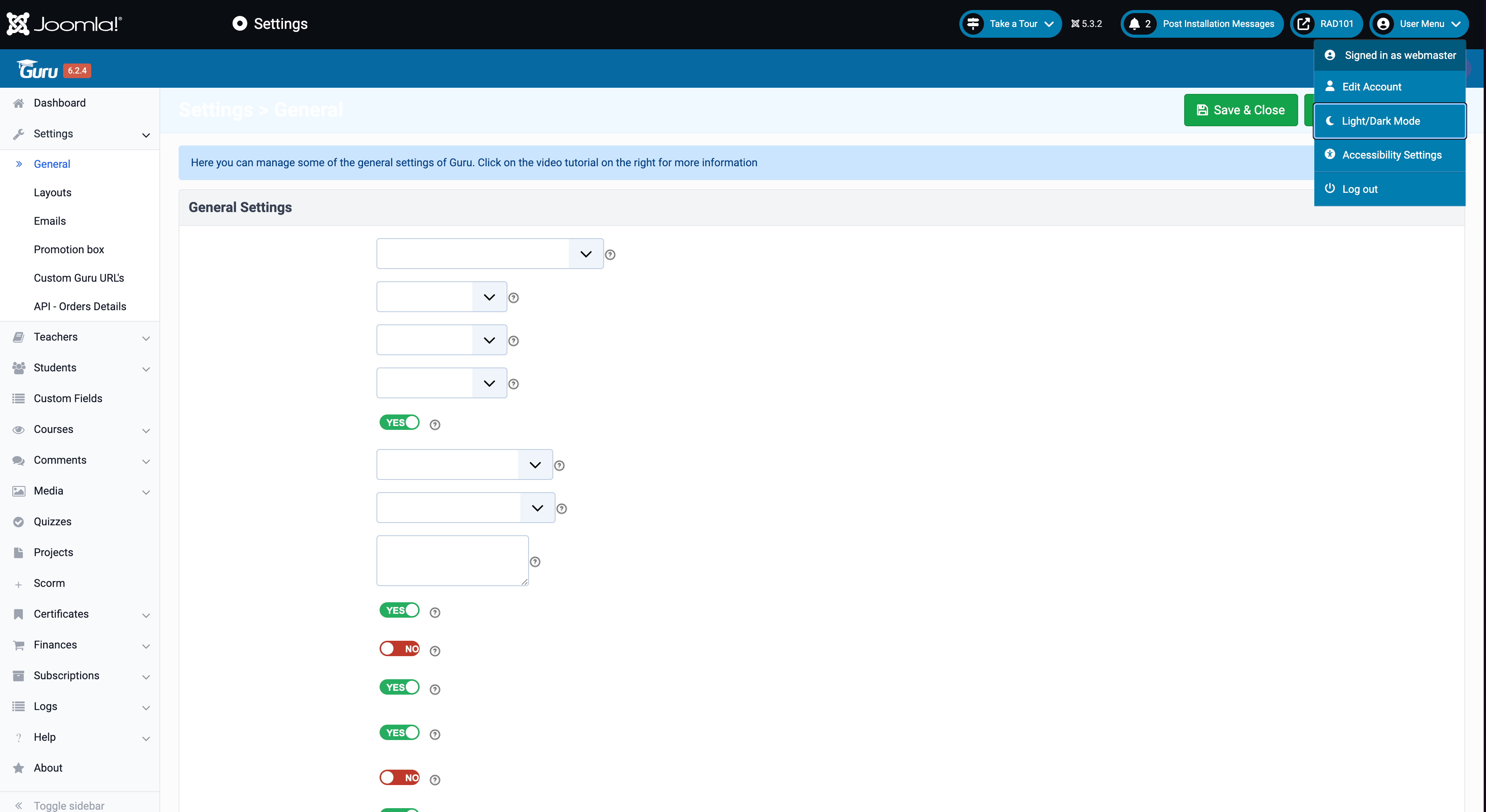 I added Guru Pro and the dashboard is completely unusable in dark mode. The text is all white and the background is white. Switching to light mode (this is done via the joomla user menu in the top right) fixes this. Joomla by default respects users system preferences, so by default if I have any admin attempt to view the dashboard they will be unable to read anything here's an example of what the settings page looks like: