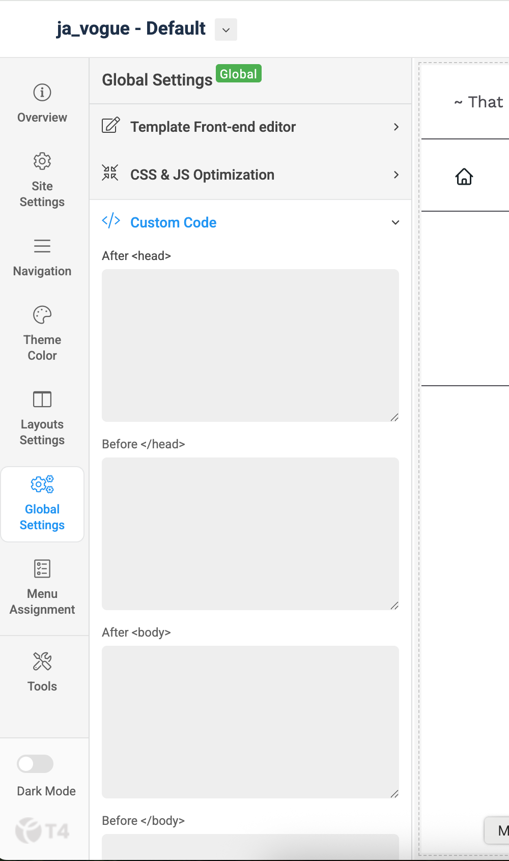 You can add custom code to template by accessing administrator panel >> Site template styles >> JA Vogue >> Global settings >> Custom code: