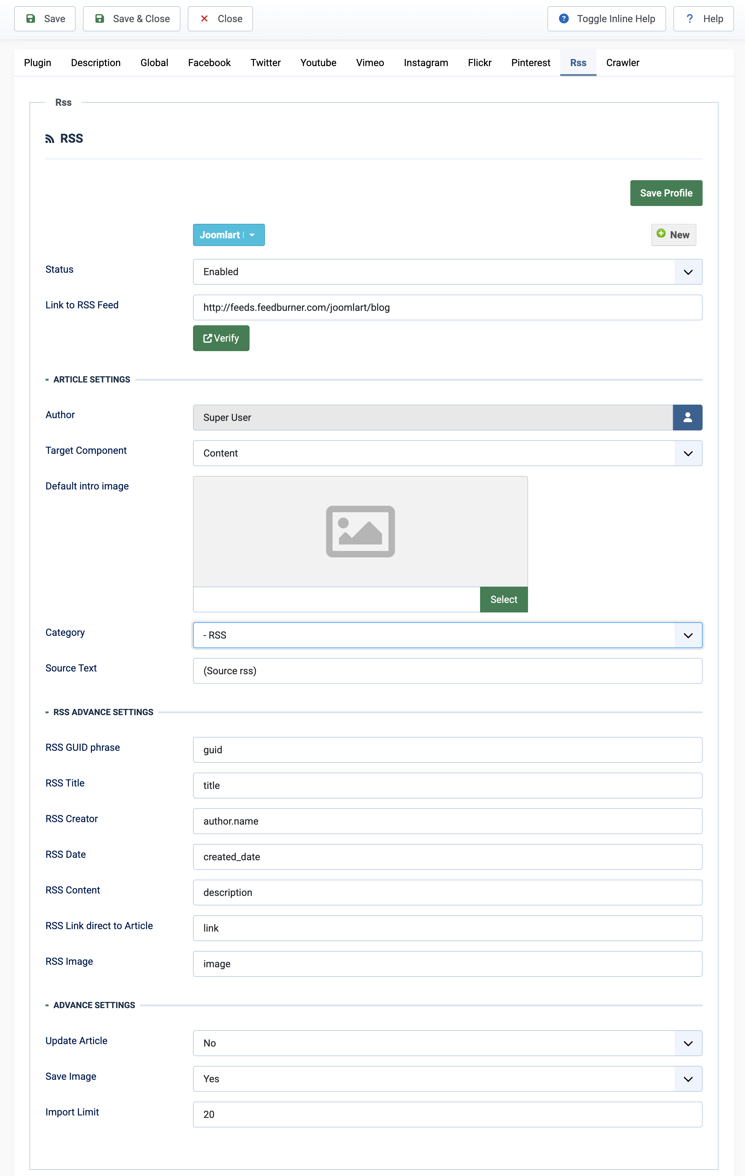 I upload my feeds via RSS in the JA Social Feed plugin.