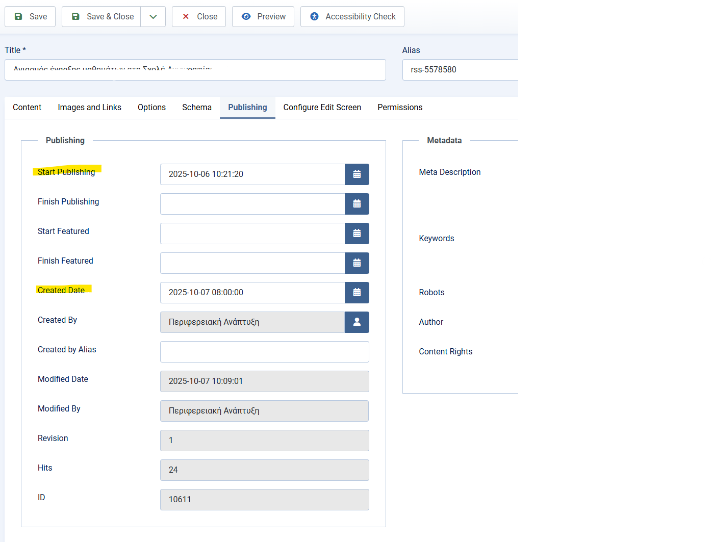 The articles that are created from these feeds get the correct create date from the feed but the publish date is one day before and in different time.