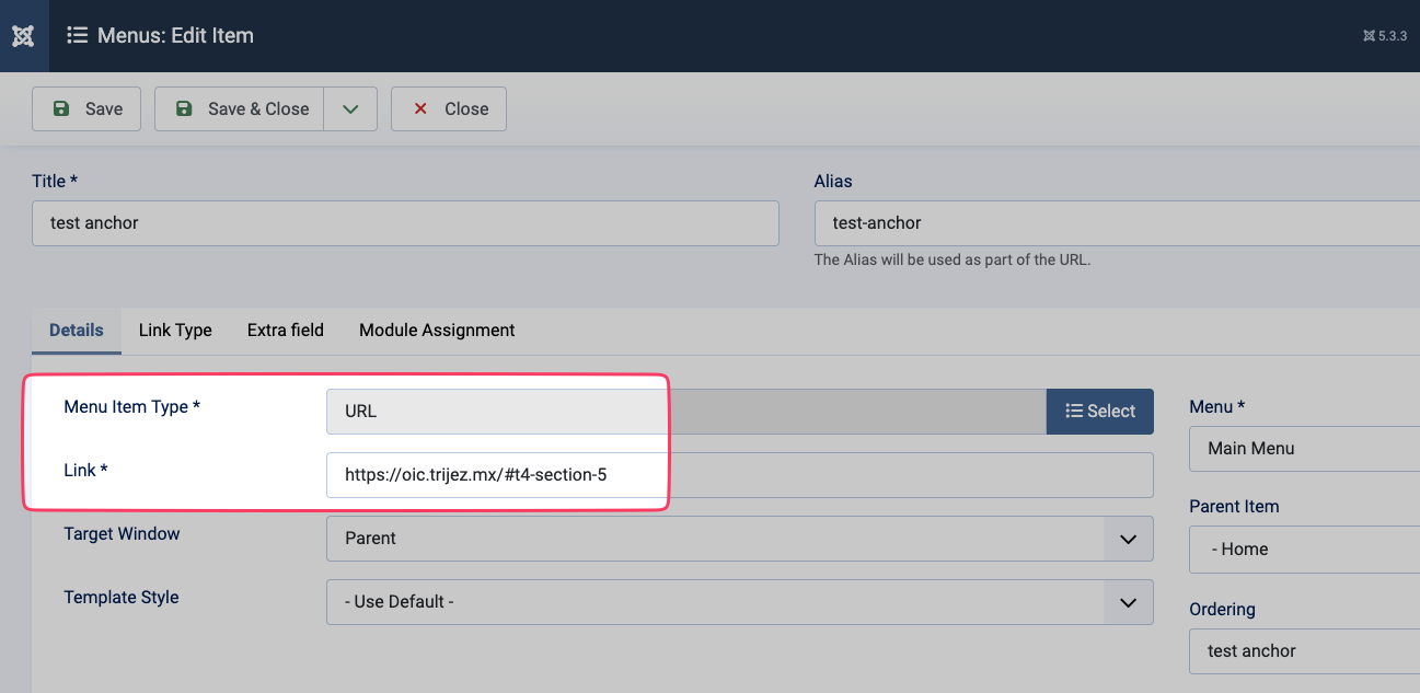 If you want to link a menu item to a specific section on homepage, you need to change it menu item type to URL: