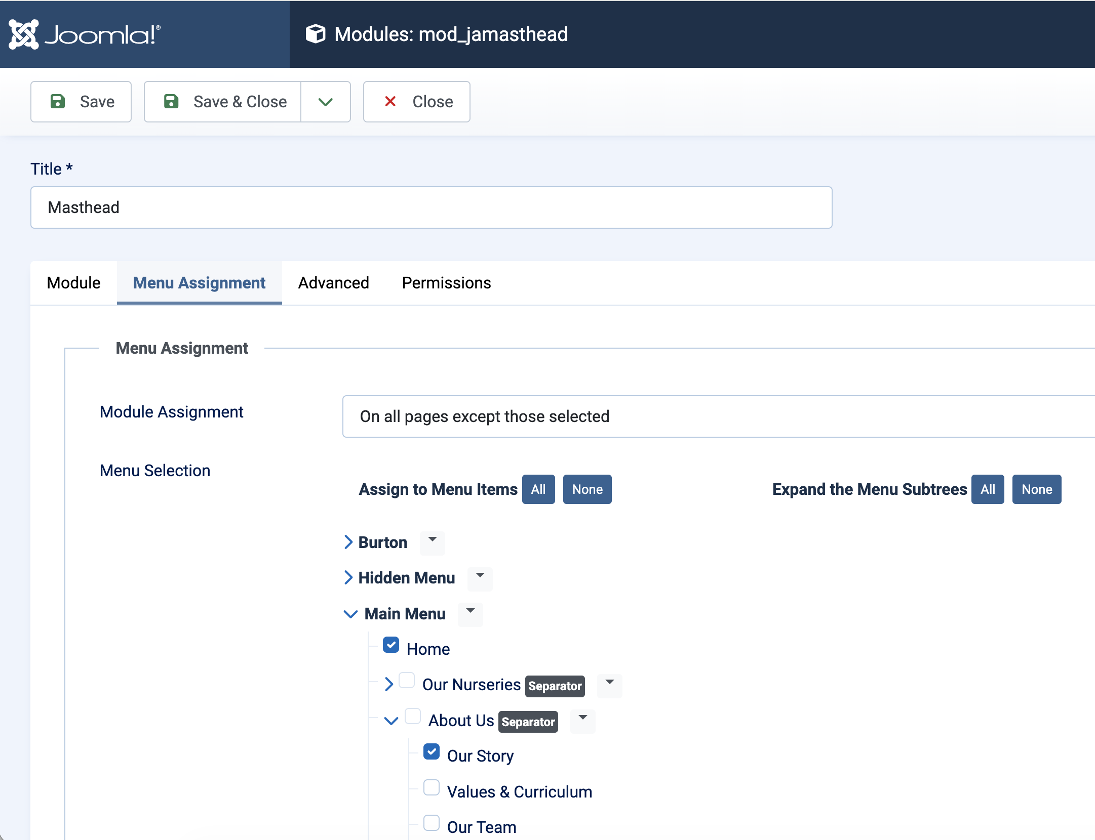 The Menu Assignment settings of the JA Masthead module handle that functionality — you can assign the module to specific pages where you want it to be displayed. 😉