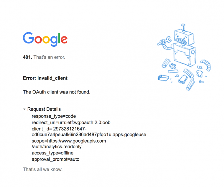 I'm trying to install JA Google Analytics Reports Module. I think I have it all set up right with the Google Analytics API and all, but when I click on the link to "Get Access Code," I end up getting a 404 error page back from Google. Any help or suggestions?
