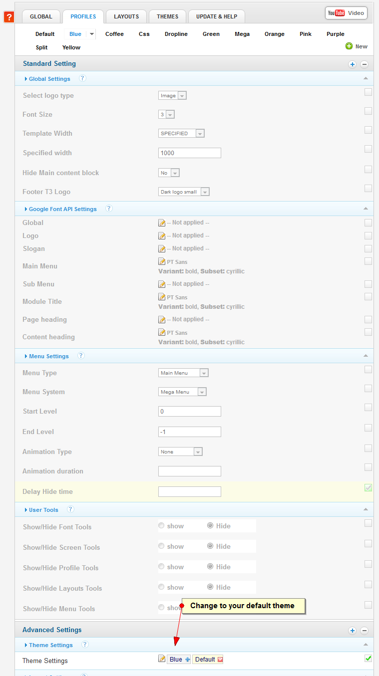 About changing default color for template, it depends on the profile you’re using for the default page in Template manager > Your default template > Profiles tab > Theme settings: http://easycaptures.com/fs/uploaded/615/3860348253.png and change to your default theme here. As in attached image, we’re using blue theme for this profile and we move theme before default one.