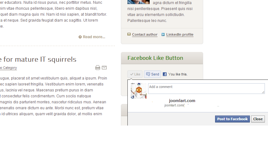2/ when i press the like button, the function works and i can see on facebook that i like the page. But behind the page title there is a description like “joomla 2.5 template features and menus for business, venture, and corporate” that i would like to remove.